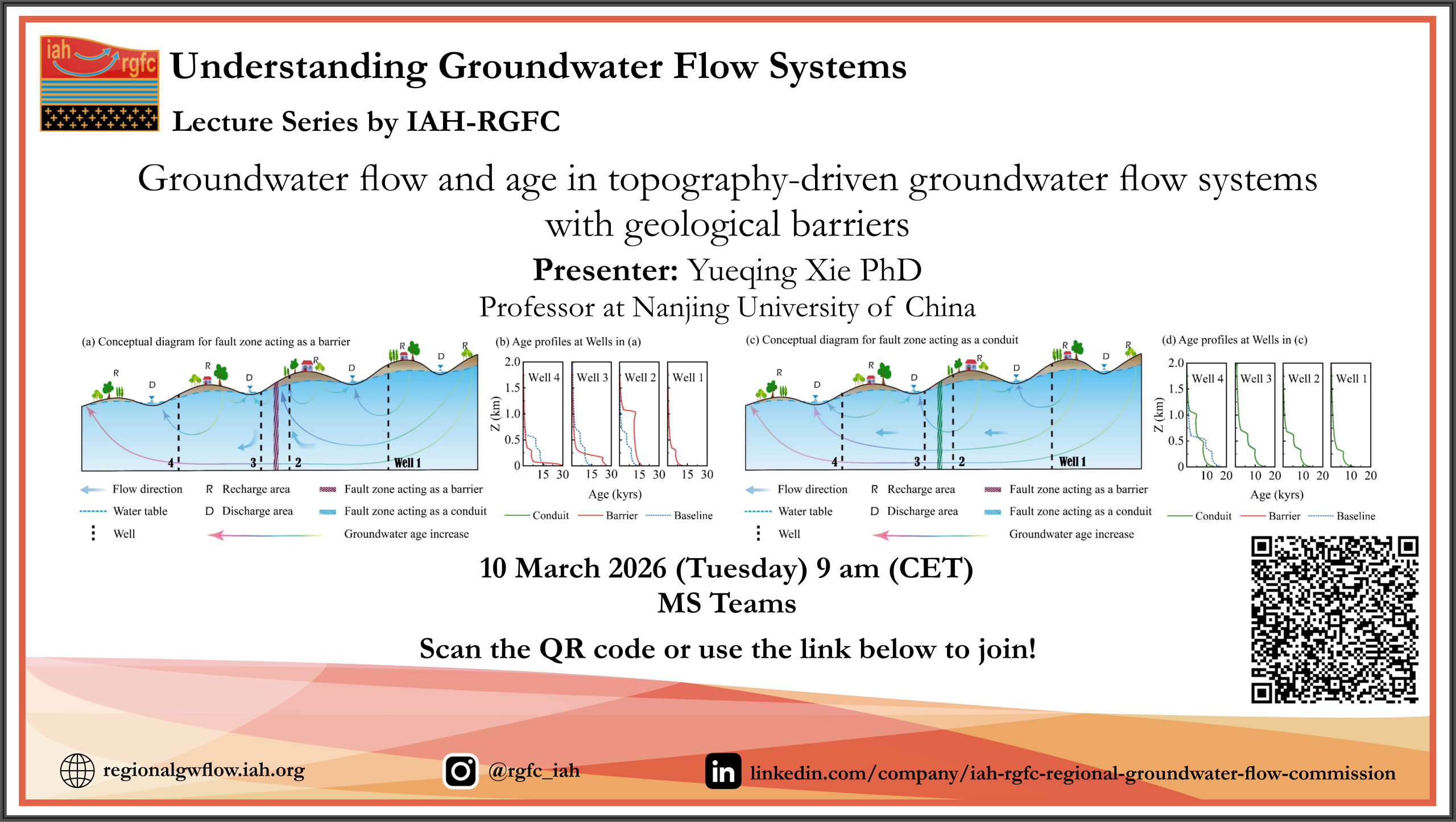 We are pleased to announce the successful launch of the IAH-RGFC Lecture Series, which aims to share the latest scientific findings on regional groundwater flow systems and foster discussion within the hydrogeological community.